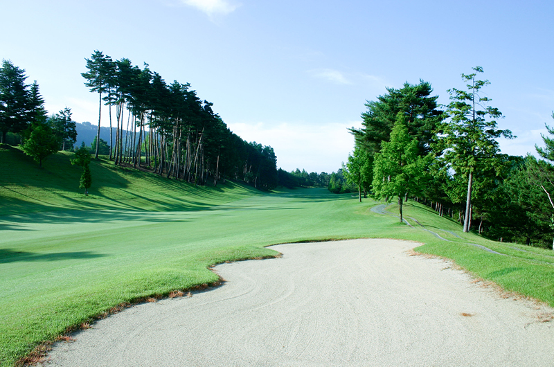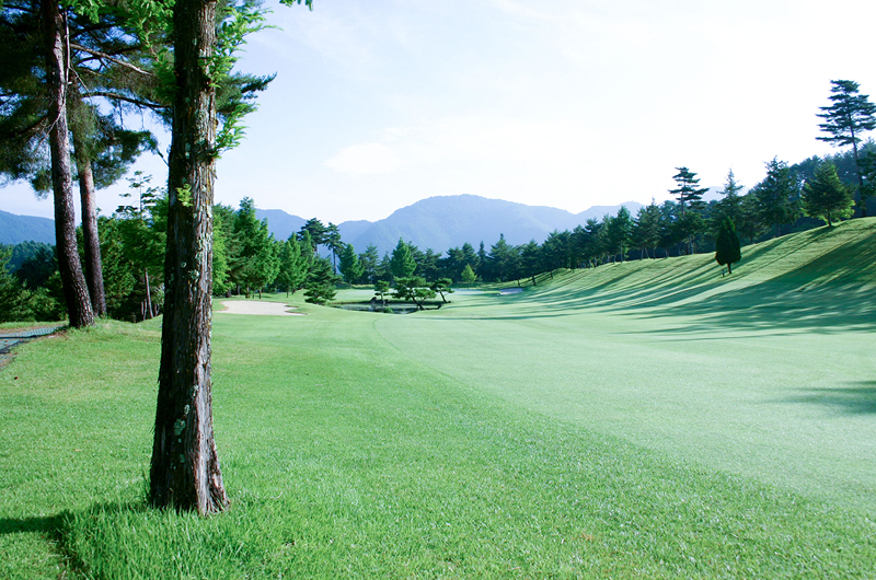 グリーン手前に池のあるロングホール。右の山上はペナルティ。